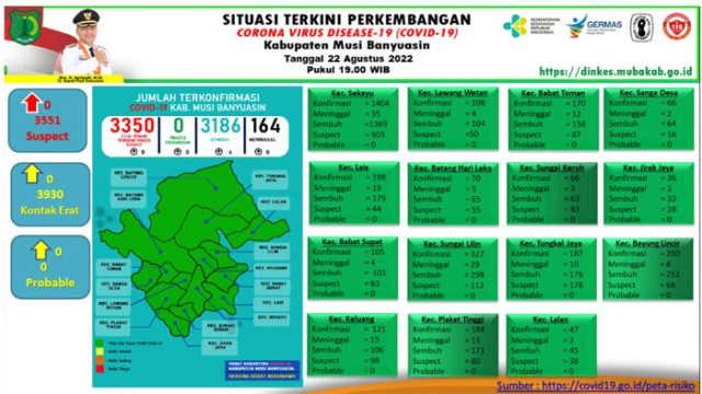 Sementara itu, berdasarkan data update Gugus Tugas Penanganan Covid-19 Muba 22 Agustus 2022 tercatat ada sebanyak 429 ODP, 429 selesai pemantauan, 0 masih dipantau, 1.199 kontak erat, 1.199 kontak selesai pemantauan, 0 kontak erat yang masih dipantau, 191 PDP, 0 proses pengawasan, serta 191 selesai pengawasan. (Tarmizi)