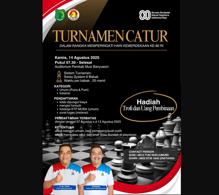 Muba, Beritakajang.com – Pemerintah Kabupaten Musi Banyuasin (Muba) akan menggelar turnamen catur dalam rangka memeriahkan Hari Ulang Tahun (HUT) ke-80 Republik Indonesia. Kegiatan ini dijadwalkan berlangsung pada Kamis (14/8/2025), bertempat di Auditorium Pemkab Muba.
