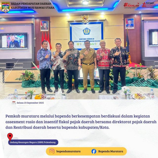 PALEMBANG, Beritakajang.com – Pemerintah Kabupaten (Pemkab) Musi Rawas Utara (Muratara) melalui Badan Pendapatan Daerah (Bapenda) terus berupaya memperkuat tata kelola Pendapatan Asli Daerah (PAD). Salah satu langkah nyata diwujudkan dengan melaksanakan kegiatan asistensi bersama Kementerian Keuangan Republik Indonesia di Palembang, Selasa (23/9/2025).