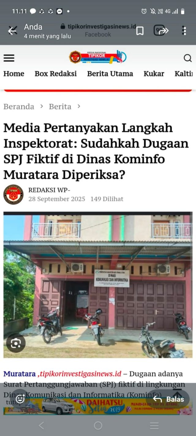MURATARA, Beritakajang.com – Berdasarkan pemberitaan adanya dugaan SPJ perjalanan Dinas fiktif di Diskominfo Muratara, diterbitkan oleh media online “tipikorinvestigasinews.id” Pada, 28-9-2025.