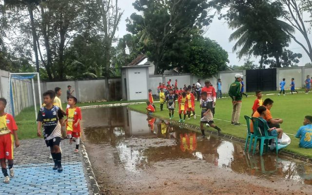 Pantauan di lokasi menunjukkan, air menggenang di sisi lapangan hingga menyerupai kubangan. Anak-anak peserta festival terlihat harus melintas di dekat genangan tersebut, sementara pertandingan tetap berjalan sebagaimana jadwal.