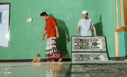 Kegiatan meliputi penyapuan dan pengepelan lantai dalam mushola, pembersihan kaca, hingga perapian area halaman dan saluran air di sekitar tempat ibadah.
